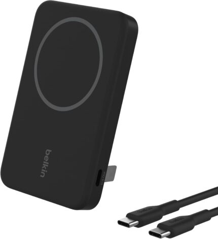 Belkin Portable Charger, Wireless Power Bank 15W 5000mAh w/ Qi2, MagSafe Charger + Built-in Pop-up Kickstand – Compatible w/iPhone 17, Air, Pro, Pro Max, Google Pixel 10, etc. – Black