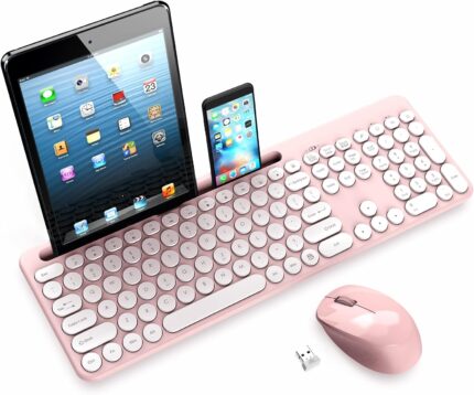 LeadsaiL Pink Wireless Keyboard and Mouse Combo, Full-Sized Ergonomic Computer Keyboard with Phone Tablet Holder, 2.4GHz Silent Cordless Keyboard Mouse Set for Windows Laptop, PC, Desktop