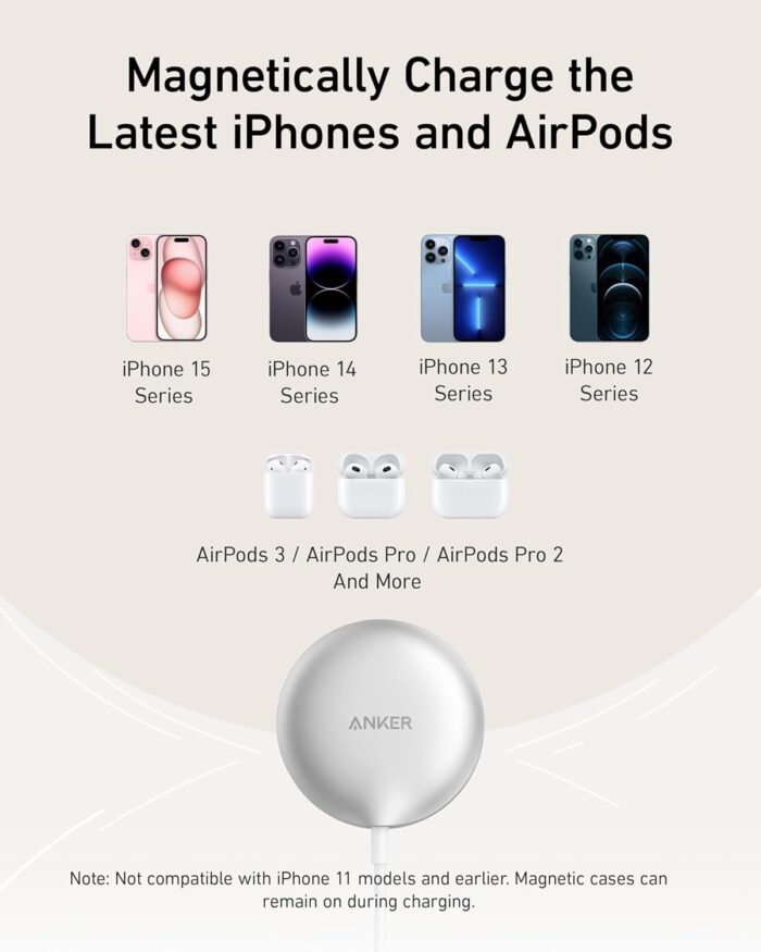 Anker MagSafe Charger Pad, MagGo iPhone 16 Wireless Charging Pad, Qi2 Certified 15W Wireless Charger, Compatible with iPhone 16/16 Plus/16 Pro/16 Pro Max/15/14/13/12 Series (USB-C Adapter Included)