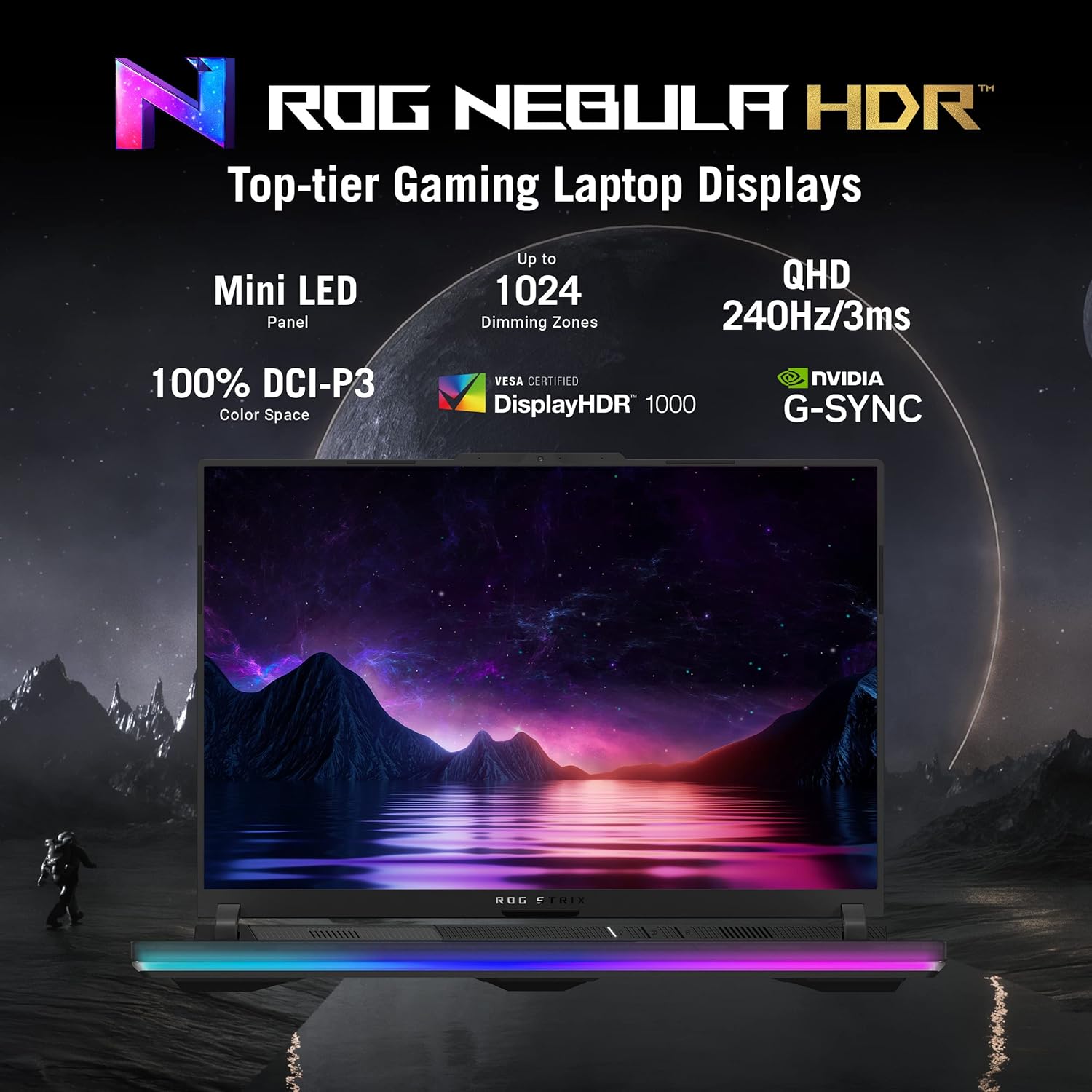 ROG NEBULA HDR DISPLAY – The Nebula HDR badge means you are getting the highest tier panel, featuring Mini LEDs with up to 1100 nits brightness and 1024 dimming zones, QHD 240Hz/3ms, 100% DCI-P3 color with Pantone Validation, among other premium features.
