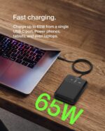 CHARGE YOUR LAPTOP ON THE GO: This versatile power bank provides power delivery up to 65W in a single USB-C port to recharge your MacBook or other compatible laptop. Charge a MacBook Pro (14″ M3) from 0-50% in just 42 minutes