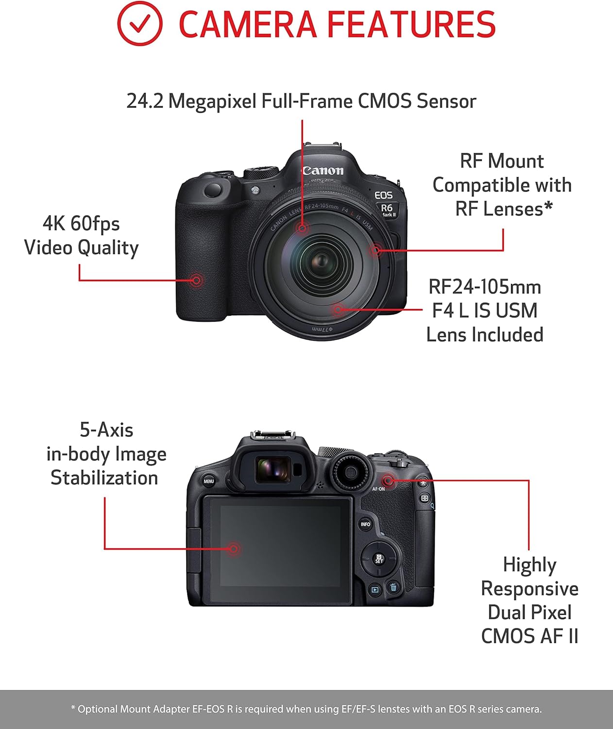 Canon EOS R6 Mark II Mirrorless Camera RF24-105mm F4 L USM Lens Kit, Hybrid Full-Frame Camera, 24.2 Megapixel CMOS Sensor. Photo and Video Camera Capabilities, RF Mount, Black