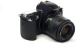 Canon EOS rebel XS a.k.a. Kiss. 35MM SLR film camera with EF mount canon lens system.+ AF System TTL phase detection. AF modes: One-Shot AF/AI Servo AF (automatic switchover). Multi-BASIS for the AF sensor. (automatic selection of 3 focusing points). Center focusing point selectable manually with AE lock button. AF operating range at ISO 100: EV 1.5 – 18. Shutter Vertical-travel, focal-plane electronic shutter. 30 sec. – 1/2000 sec., B. X-sync at 1/90 sec. (hot shoe). Built-in electronic self-timer (with beeper). Viewfinder Fixed eye-level roof mirror. 0.7x magnification and 90% coverage. Viewfinder Information Center AF mark, wide AF frame, partial metering circle. 7-segment LCD displays numeric values, textual display, in-focus indicator, exposure display, shutter speed, aperture setting, red-eye reduction lamp, flash ready, panorama frame (set with external lever), and other indications. Metering & Exposure Control Composite SPC for TTL full-aperture metering (6-zone evaluative, 9.5% partial at center, and center-weighted averaging) with shutter speed-priority AE, aperture-priority AE, Intelligent program AE, depth-of-field AE, four program AE modes, and metered manual. Exposure compensation range of ±2 EV (in 1/2-stop increments). Metering range at ISO 100 and f/1.4: EV 2 – 20. Film speed range: ISO 6 to 6400. Maximum 9 multiple exposures. External LCD Shutter speed, aperture setting, film speed, multiple exposure count, red-eye reduction, self-timer display, film status, exposure display, battery check, and other indications. Built-in Flash Located on pentaprism hump. Auto pop-up head. TTL autoflash control (fires automatically in backlight and low-light conditions). Off-the-film metering with a 4-zone flash metering sensor covering three flash metering points. Red-eye reduction lamp (AF-assist beam emitter) provided. Guide No. 12 (at ISO 100 in m). Power Source Two 3 V CR123A lithium batteries.