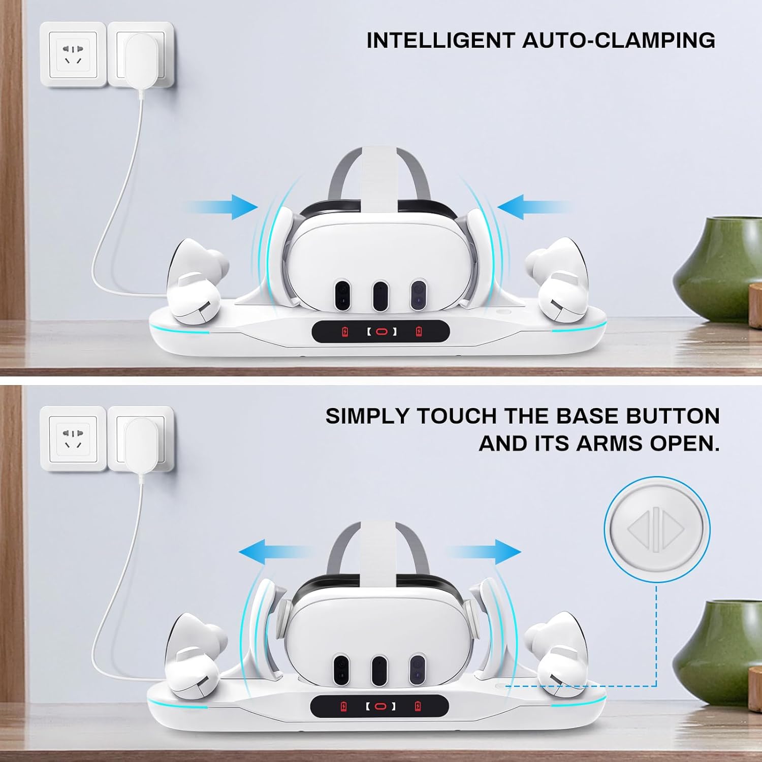 Charging Dock for Meta Quest 3, Auto-Clamping VR Charging Stand for Quest 3 VR Headset and Controllers, Magnetic Fast Charging Station Accessories with 2 Rechargeable Batteries, LED Indicator