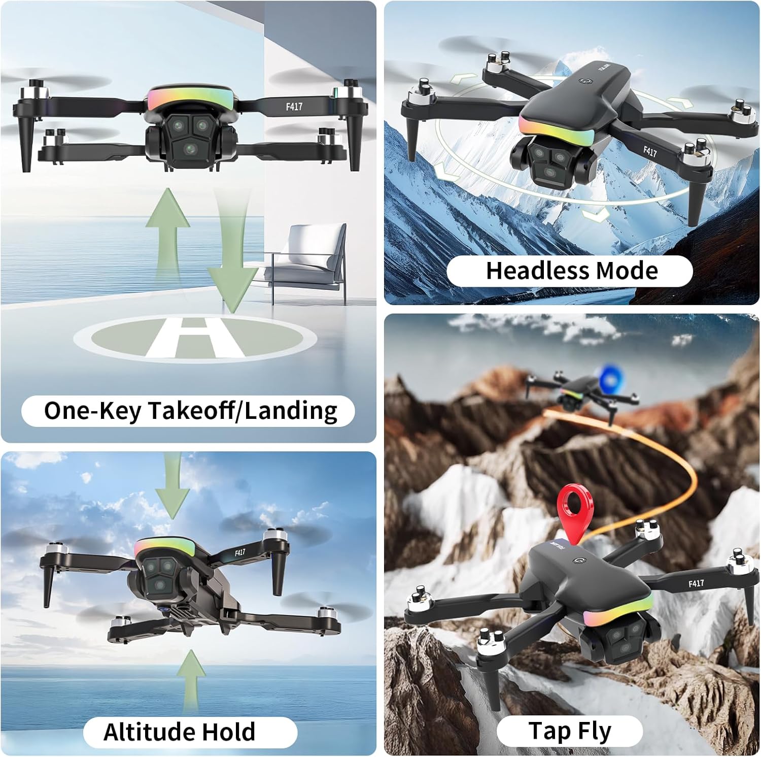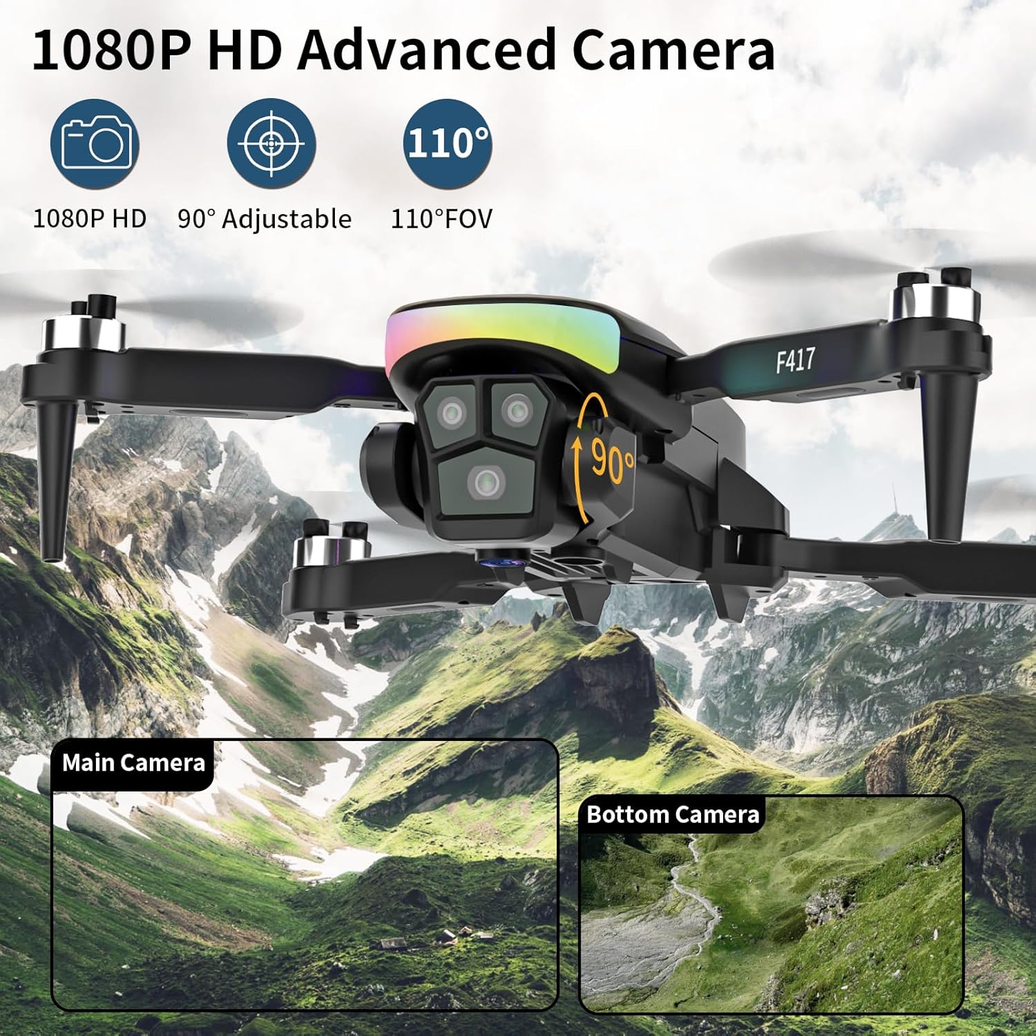 Colored LED lights: Elevate your flight experience with F417 drone adults long range, featuring vibrant 7-color LED strips with 10 bright lights. Brighter lighting modes on mini drone enhance visibility, ensuring safety during aerial shows in night flight.