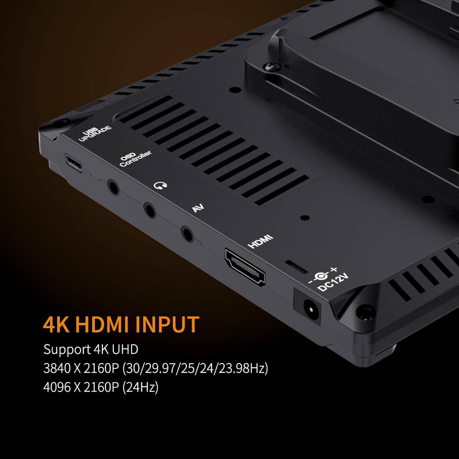 【HDMI Input】FW759 on camera monitor supports 4K HDMI and AV input, making it compatible with most DSLRs cameras and camcorders. HDMI input support format: 4K UHD 3840×2160p (30/29.97/25/24/23.98Hz), 4096×2160p (24Hz)