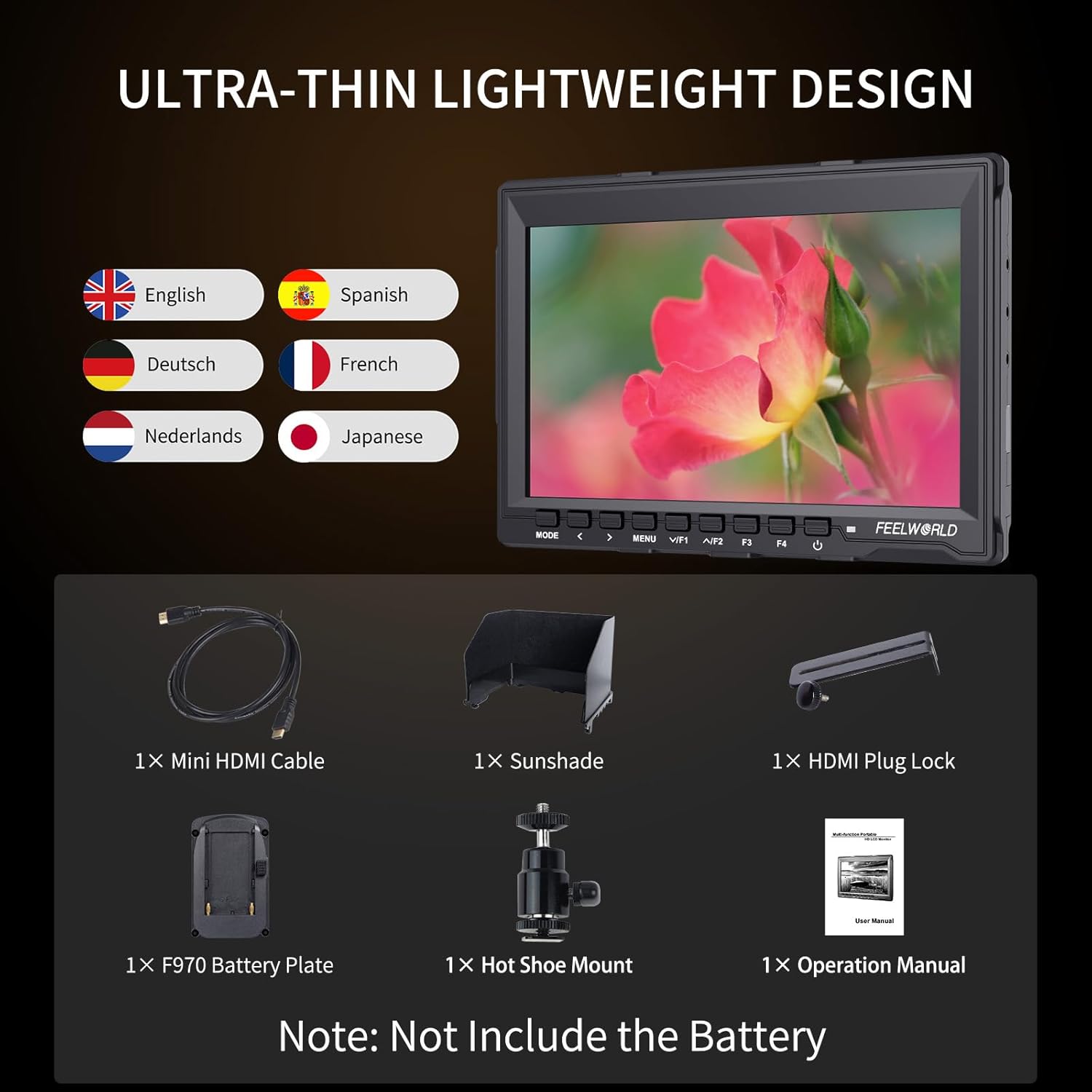 【Package Include】1× Feelworld Monitor FW759, 1× Mini HDMI Cable, 1× Sunshade 1× Hot Shoe Mount, 1× F970 Battery Plate, 1× HDMI Plug Lock, 1× Operation Manual. Note: battery and power cord not include, to purchase compatible battery combinations for our product, please search FEELWORLD FW759 with battery