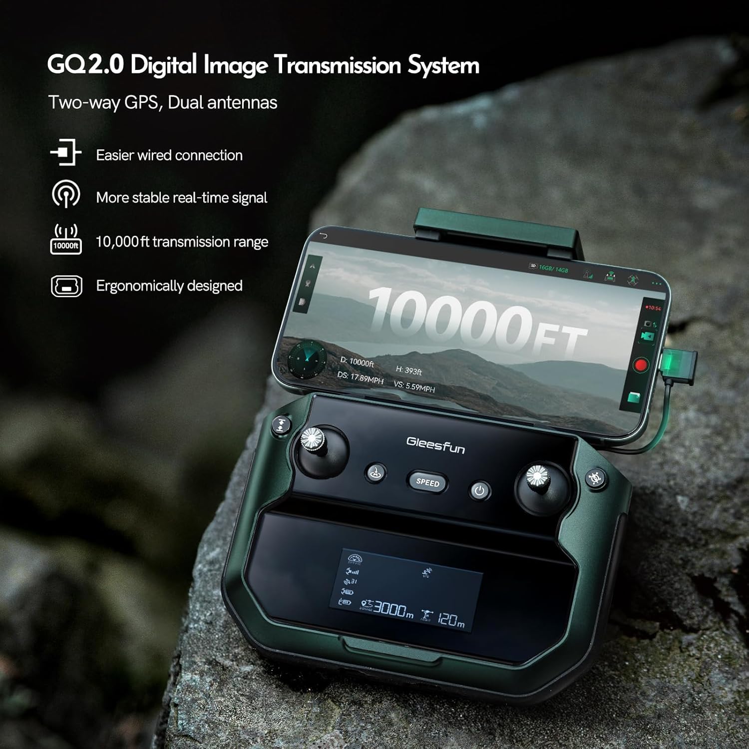【𝗚𝗤𝟮.𝟬 𝗗𝗜𝗚𝗜𝗧𝗔𝗟 𝗜𝗠𝗔𝗚𝗘 𝗧𝗥𝗔𝗡𝗦𝗠𝗜𝗦𝗦𝗜𝗢𝗡 𝗦𝗬𝗦𝗧𝗘𝗠】The GQ2.0 digital transmission system utilizes a high-performance image transmission chip for faster, more stable image transmission. Its two-way, dual-antenna design ensures stable and clear transmission over distances of up to 10,000 ft, delivering smooth, lag-free image transmission without frame drops. The plug-and-play wired connection technology offers ease of use, making it ideal for both beginner users and daily convenience. The remote control is designed with ergonomics in mind, providing a comfortable, heavy feel and easy button operation tailored to individual usage habits.