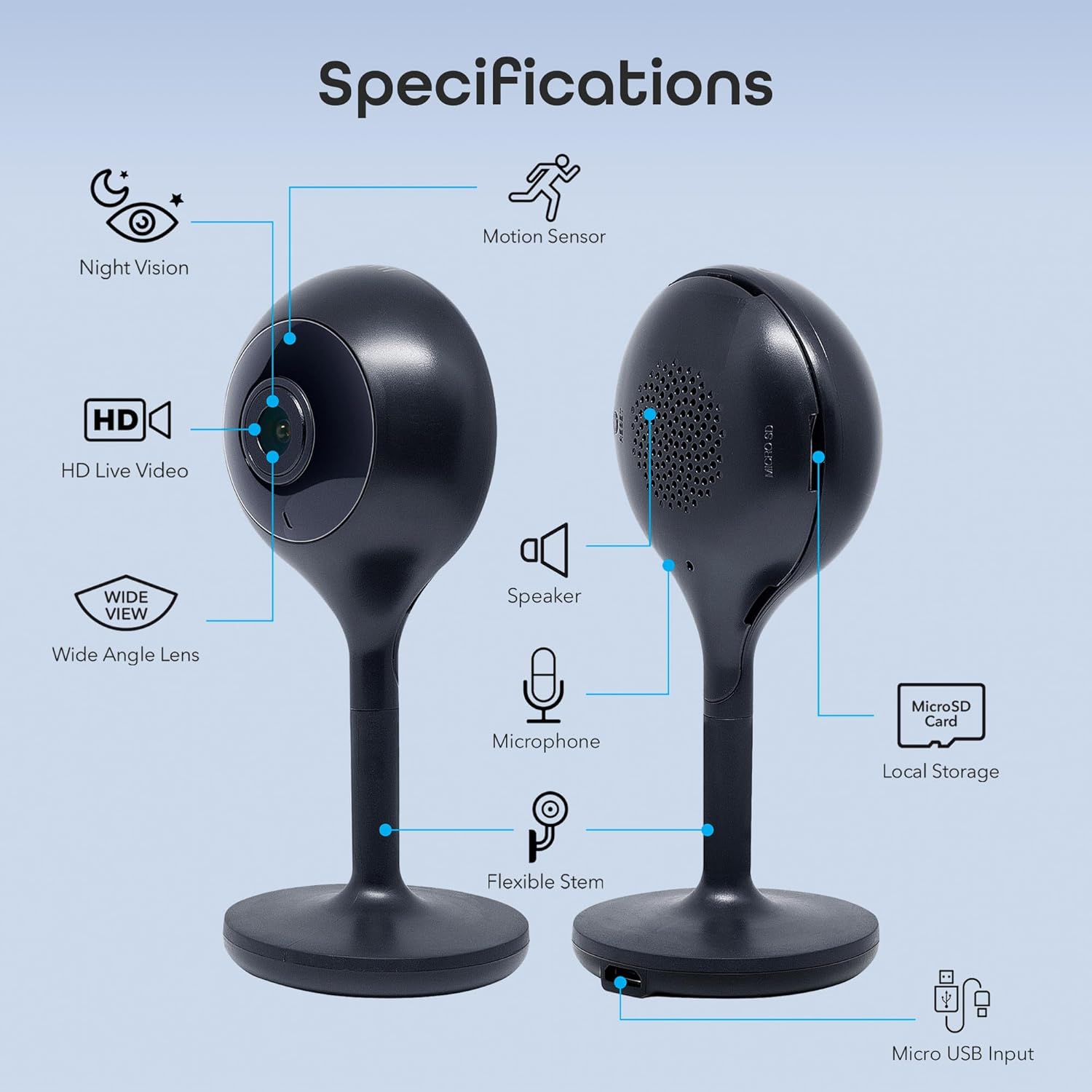 Safe Storage Options: Easily install these smart home security cameras using the adhesive base and flexible stem. Connect to 2.4GHz Wi-Fi to stream 24/7, and save recordings via optional cloud storage or a MicroSD card (up to 128GB, sold separately).