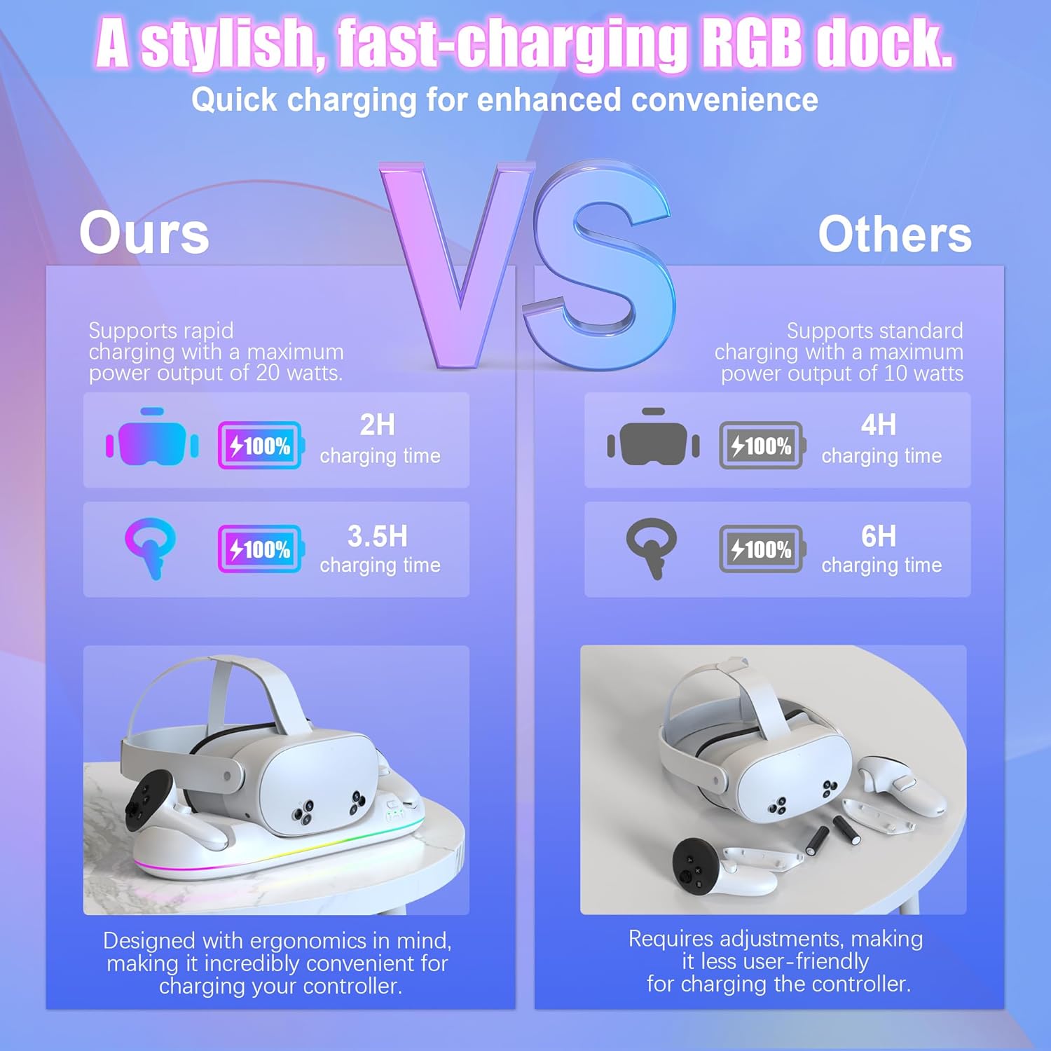 [Ultra-Fast 20W Charging ] Charge your Meta Quest 3/3S/2 headset (full charge in ~2hrs) and controllers (~3.5hrs) simultaneously with PD 30W fast-charging technology. Features overcharge/overheat/short-circuit protection and an extra USB-C port for charging other devices.