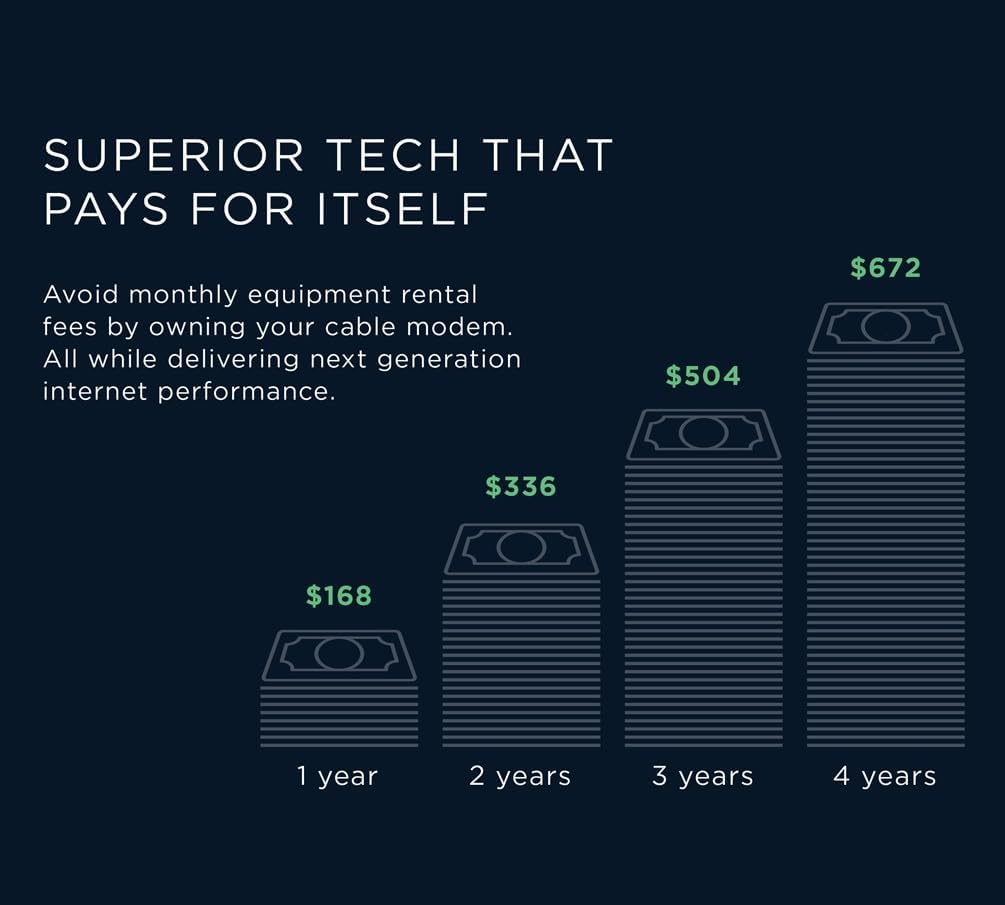 Superior next generation technology but pays for itself. Owning your own modem eliminates up to $168 per year in monthly rental charges.