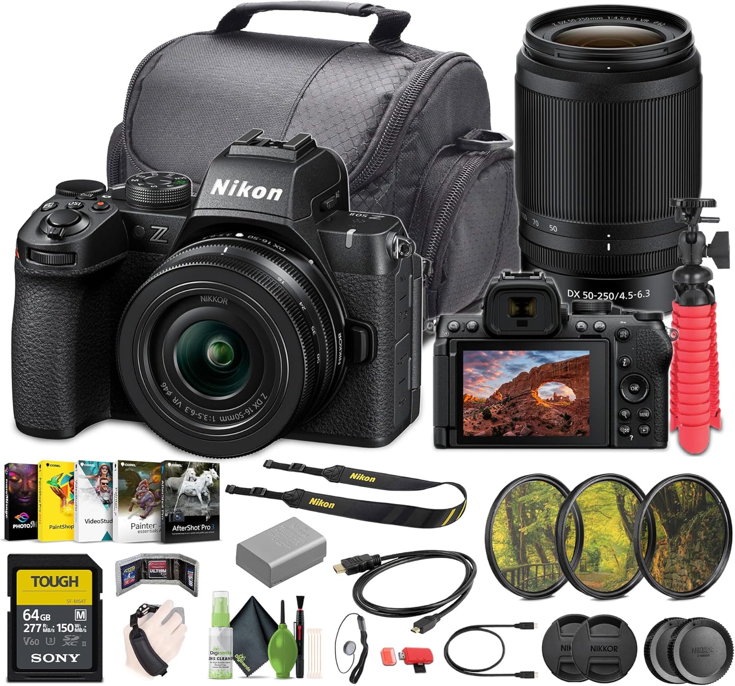 Bundle Includes: Nikon Z50 II Mirrorless Digital Camera with 16-50mm & 50-250mm Lenses + 64GB SF-M Tough Series UHS-II SDXC Memory Card + 3PC MC Pro Filter Kit UV/CPL/F 46 + Cleaning kit + 12 inch Flexible Tripod + Memory Card Wallet + USB Card Reader, SD/microSD + Travel Bag + Hand Strap (SLR/Video) + Lens Cap Keeper + Micro HDMI Cable 6 FT + Corel Photo, Video, & Art Suite Deluxe
