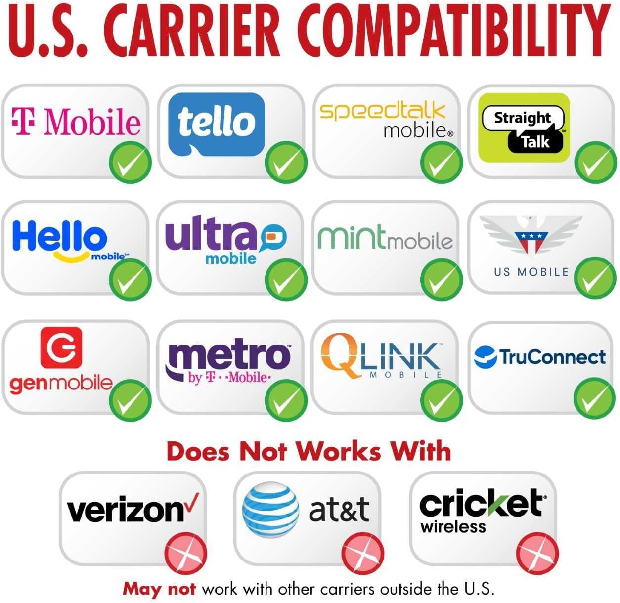 NOT COMPATIBLE WITH – This device is not compatible with Verizon, AT&T, Cricket, Boost Mobile, Tracfone, Pulse Cellular, Union Wireless, Spectrum, or any CDMA carriers worldwide. For more information about carrier compatibility, please contact our customer support team.