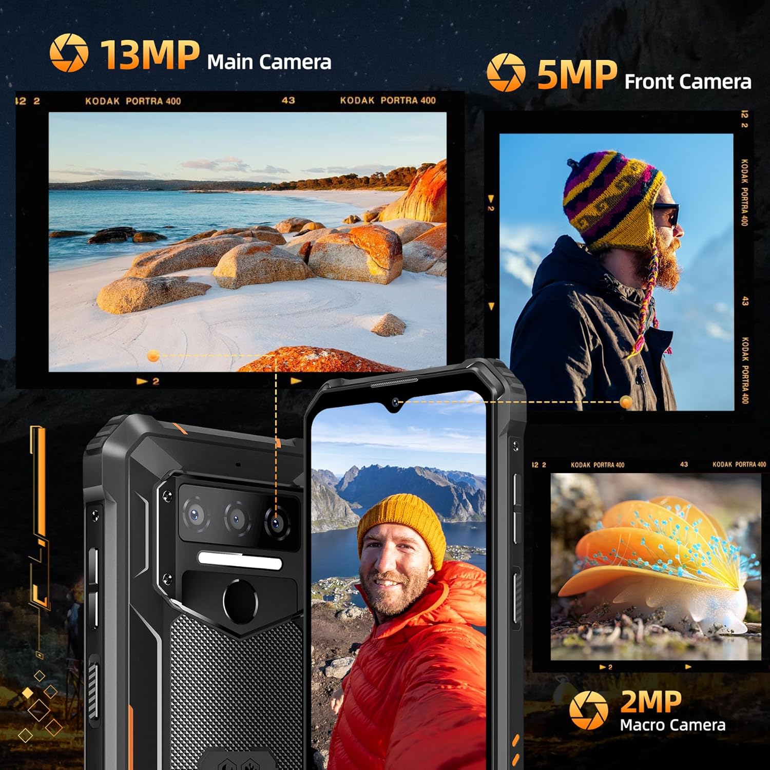 6.52″ HD Display & 13MP Main Camera: The OUKITEL wp23 plus outdoor phone features a 6.52″ HD Display, delivering vibrant visuals, 60Hz refresh rate, enjoy smooth scrolling, whether watching movies, gaming, or browsing, the expansive display elevates your visual experience to the next level. with 400 nits brightness, this rugged phone ensures excellent visibility even under direct sunlight. Also, capture stunning photos with the 13MP main camera, complemented by a 5MP front camera and a 2MP macro camera, record your adventurous moments on your wp23plus rugged cellphone and share them with friends and family.