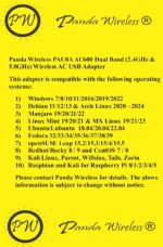 Multi-OS support: Windows 7/8/10/11/2019/2022, Zorin, MXLinux, EndeavourOS, Mint, Manjaro, Ubuntu, Lubuntu, Kubuntu, Pop!_OS, Fedora, Rocky, Debian, Arch Linux, openSUSE, Kali Linux, Tails, Raspbian and Puppy. NO Mac support for Panda Wireless PAU0A.
