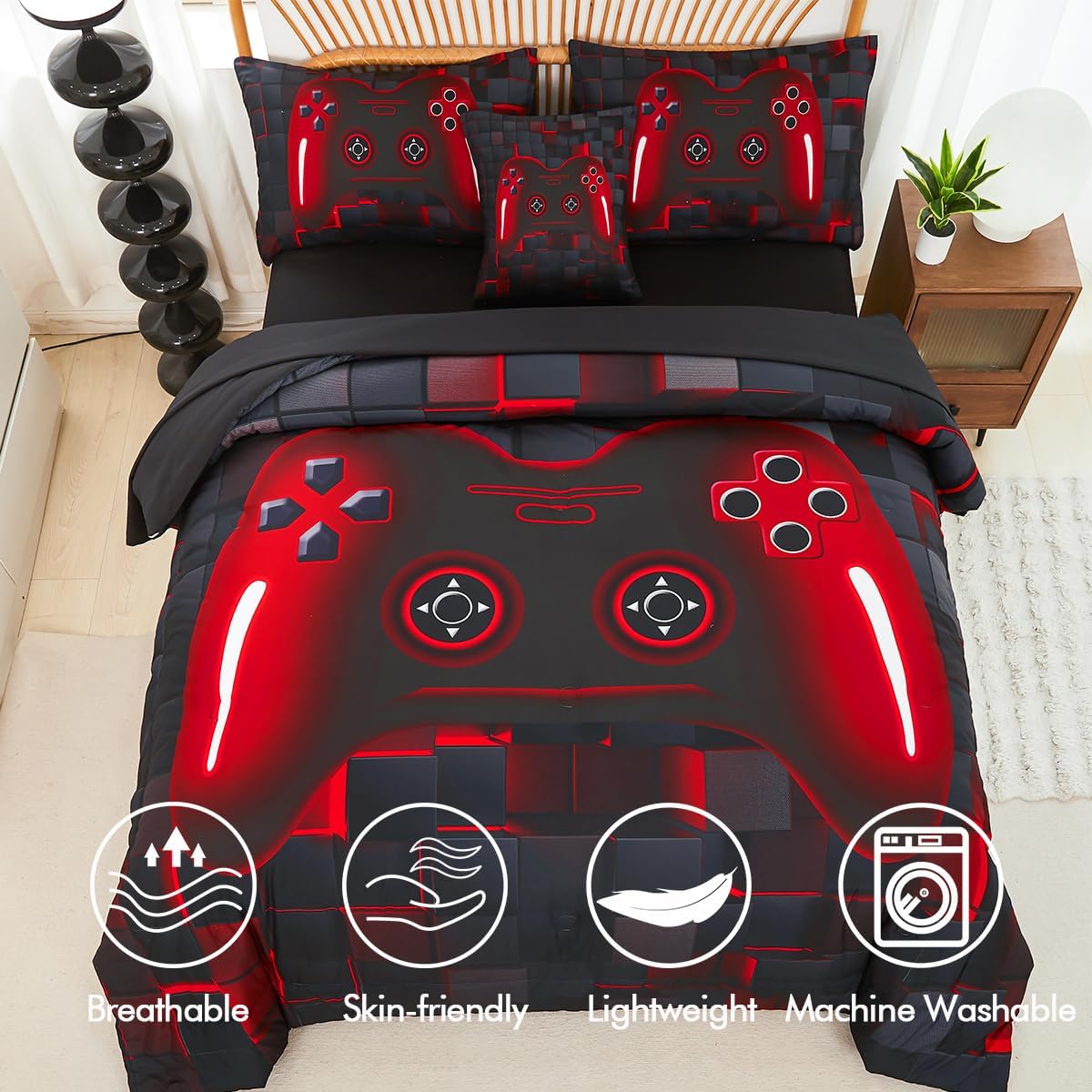 PERFEMET Boys Bedding Set Twin Size 6-Piece Game Console Comforter Set for Kids Teen 3D Black and Red Gamepad Gaming Bed in a Bag Matching Sheet Set(Red, Twin)