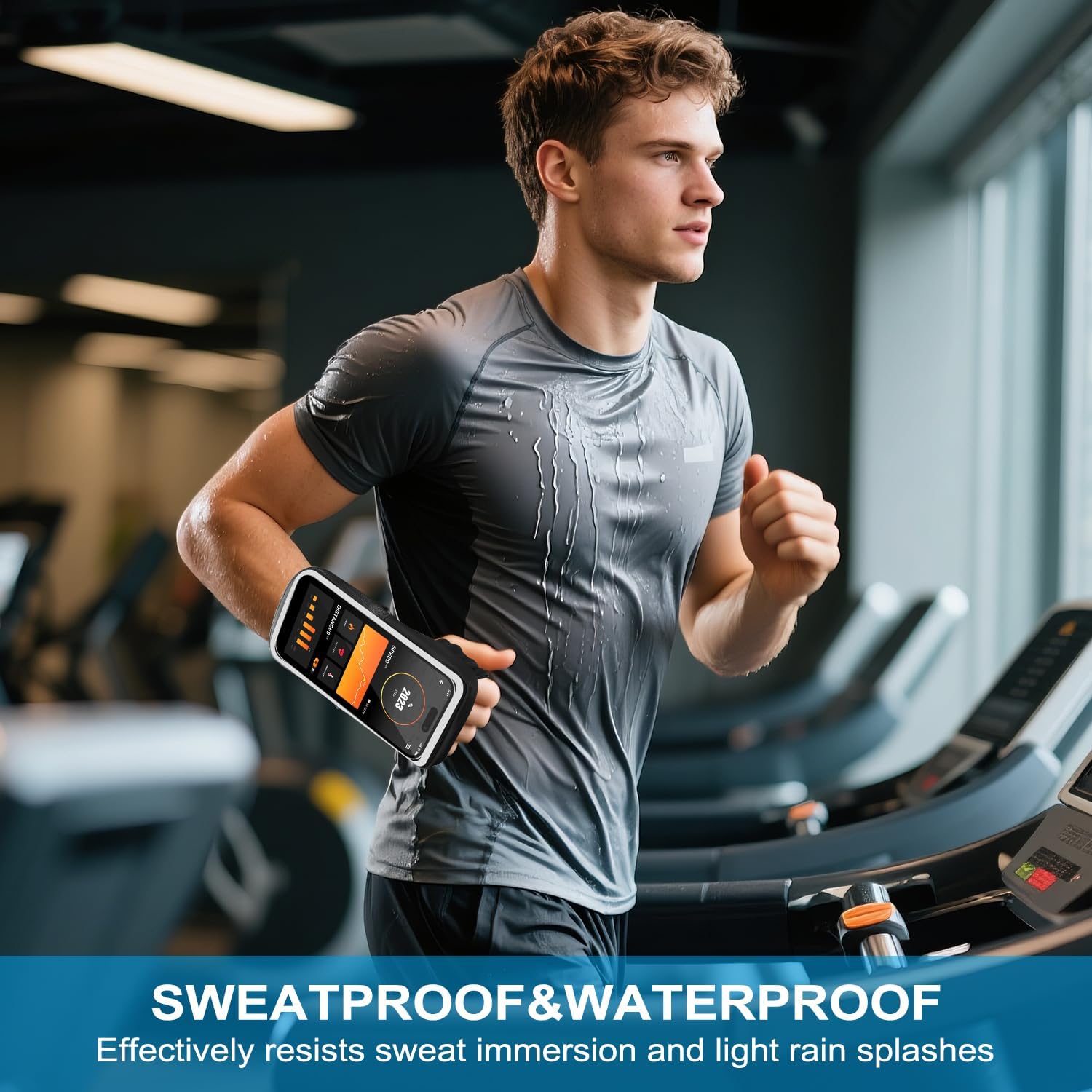 [Waterproof and Breathable]-Made from premium waterproof fabric and PVC material, this wrist armband is soft, lightweight, and sweat-resistant. The breathable perforated design effectively prevents discomfort caused by heat during your workouts.