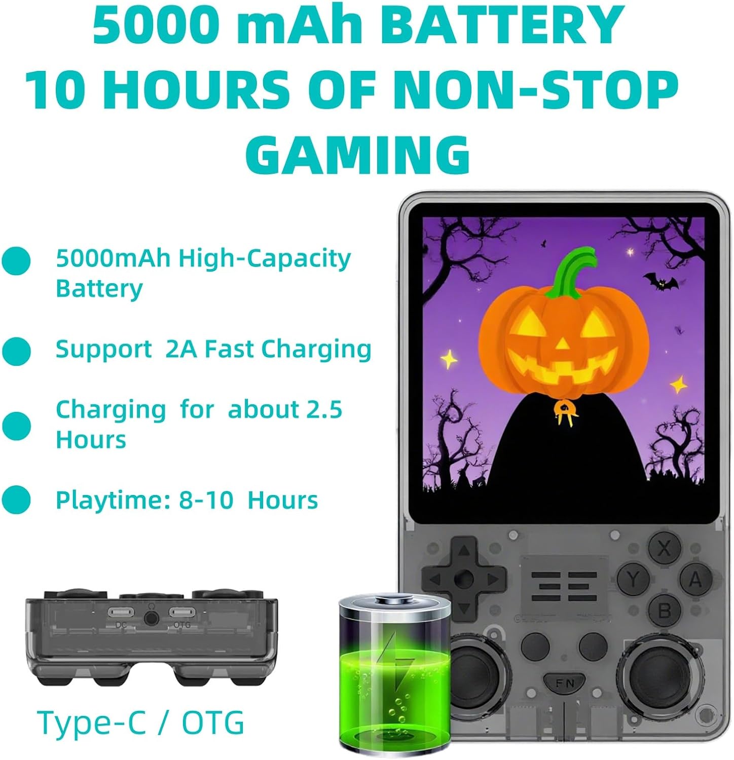 【5000mAh High-Capacity Battery for 10 Hours of Non-Stop Gaming】Built-in 5000mAh large-capacity lithium battery supports up to 10 hours of continuous gameplay, ideal for travel and long journeys. With a USB Type-C port supporting fast charging, this Retro Gaming Console Handheld stays powered up, letting you enjoy uninterrupted retro gaming fun without frequent recharges