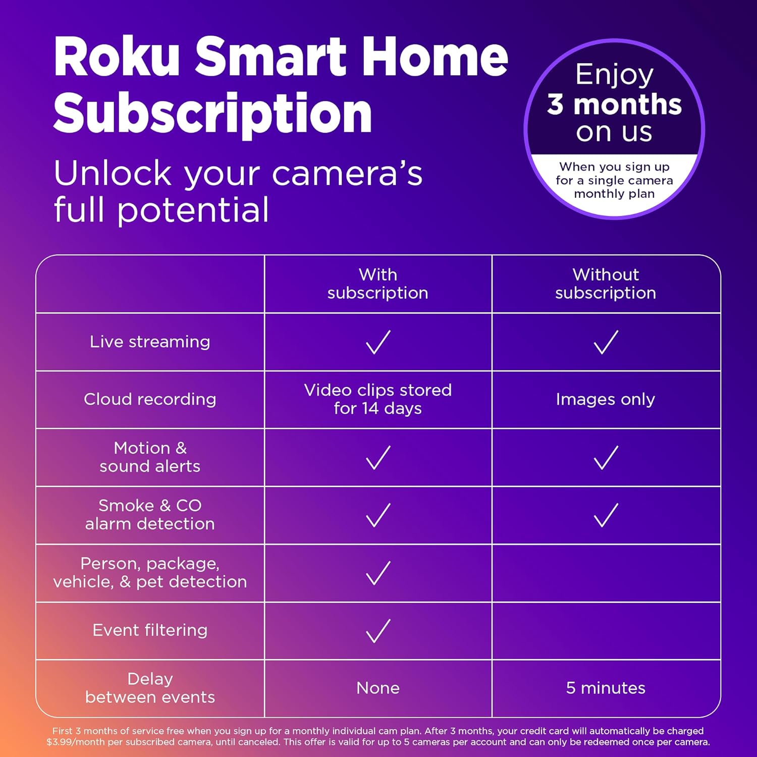 Unlock even more features: With a Roku Smart Home Subscription, you get 14-day cloud storage for video clips, plus smart detection that discerns whether that motion alert was a person, pet, or package.