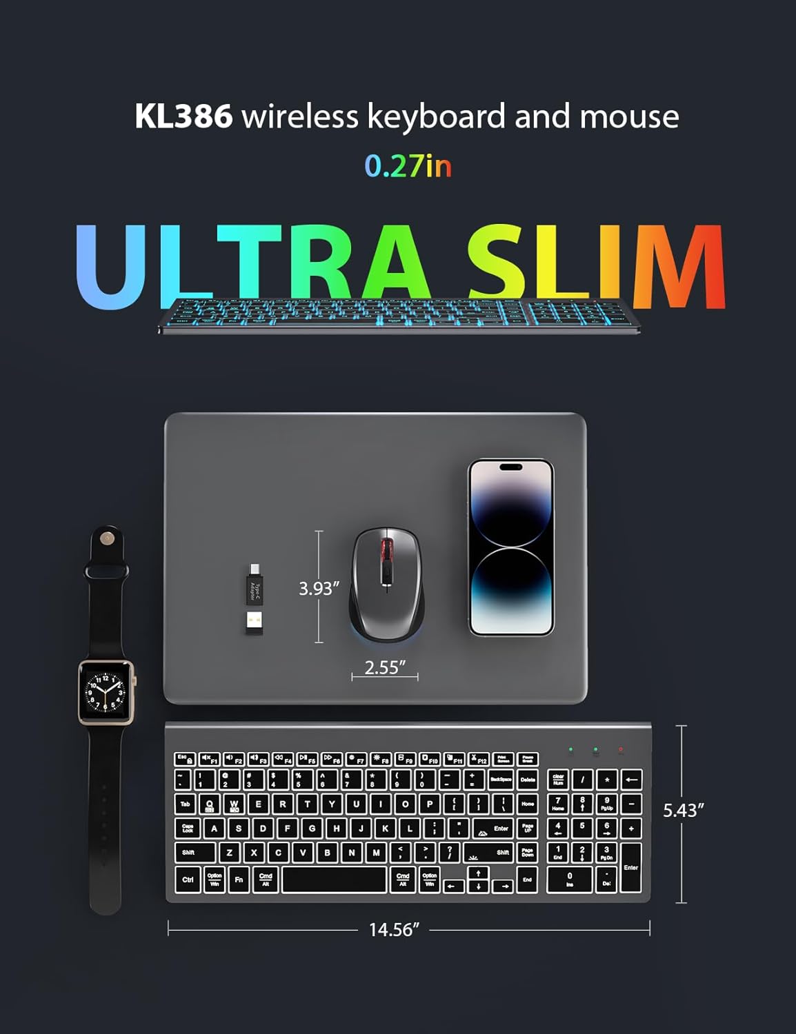 SABLUTE Wireless Keyboard and Mouse Combo Backlit – Compact Quiet Keyboard with RGB Mouse, Rechargeable, Slim, Sleep Mode, Portable Cordless Keyboard Mouse Set for Mac, Windows, Laptop (Space Gray)