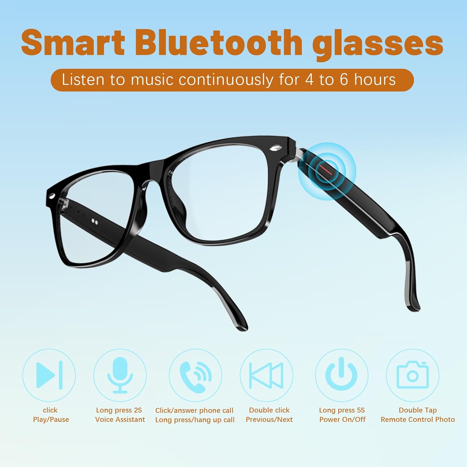 【Waterproof & Material】These clear blue light smart glasses are IPX5 waterproof. The lens adopts A-3 layer coating blue light filter, high hardness, scratch resistance, frame & temples are made of polymer EMS-TR90 Pc material, which is comfortable to wear and durable.