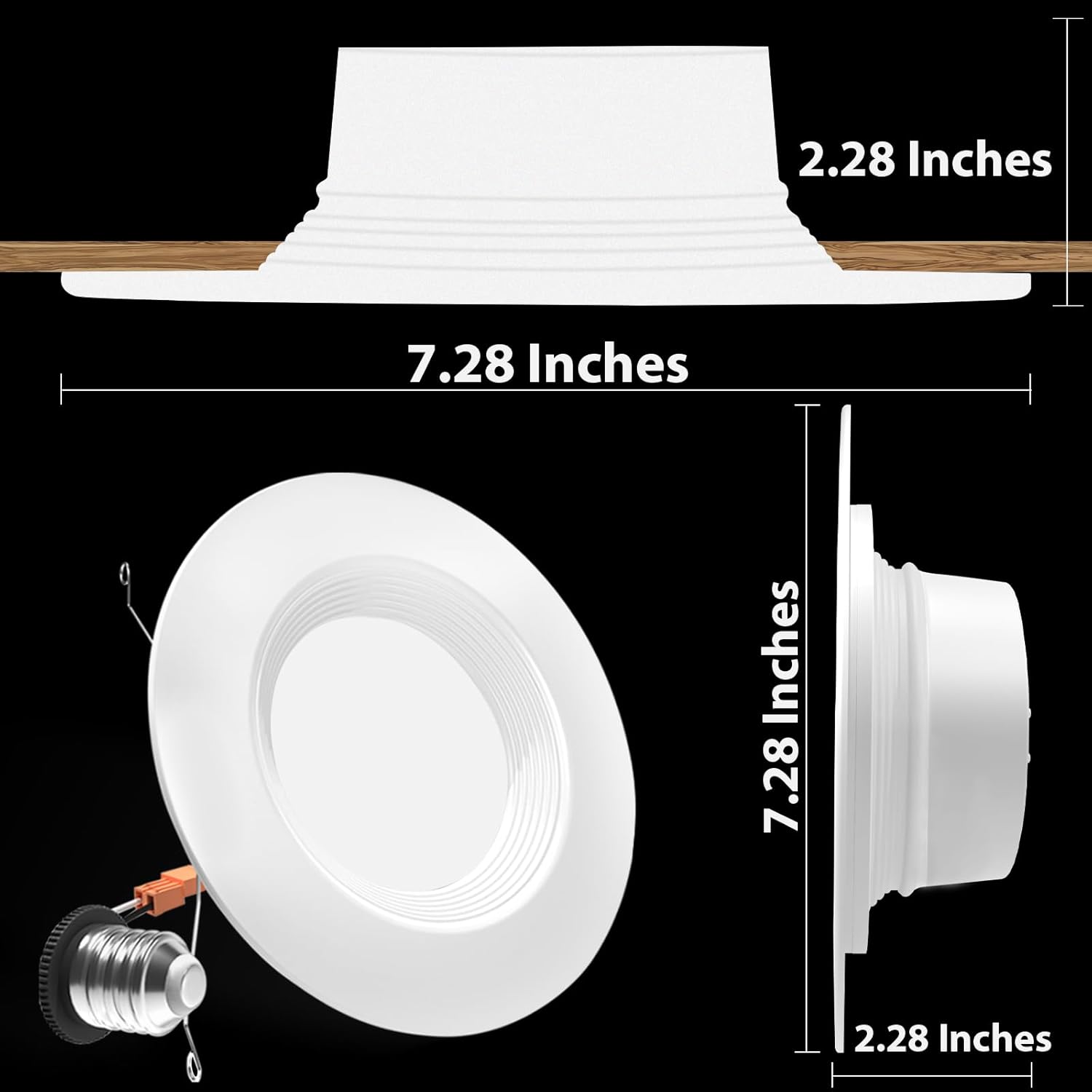 Safety and Efficiency: Our recessed lights are IC rated for safe insulation contact, damp rated for versatile use, and certified by ETL, FCC & Energy Star. They offer significant energy savings, using only 13 Watts to produce 1050 Lumens (5/6 Inch Version)—saving up to 88% in energy compared to traditional bulbs.