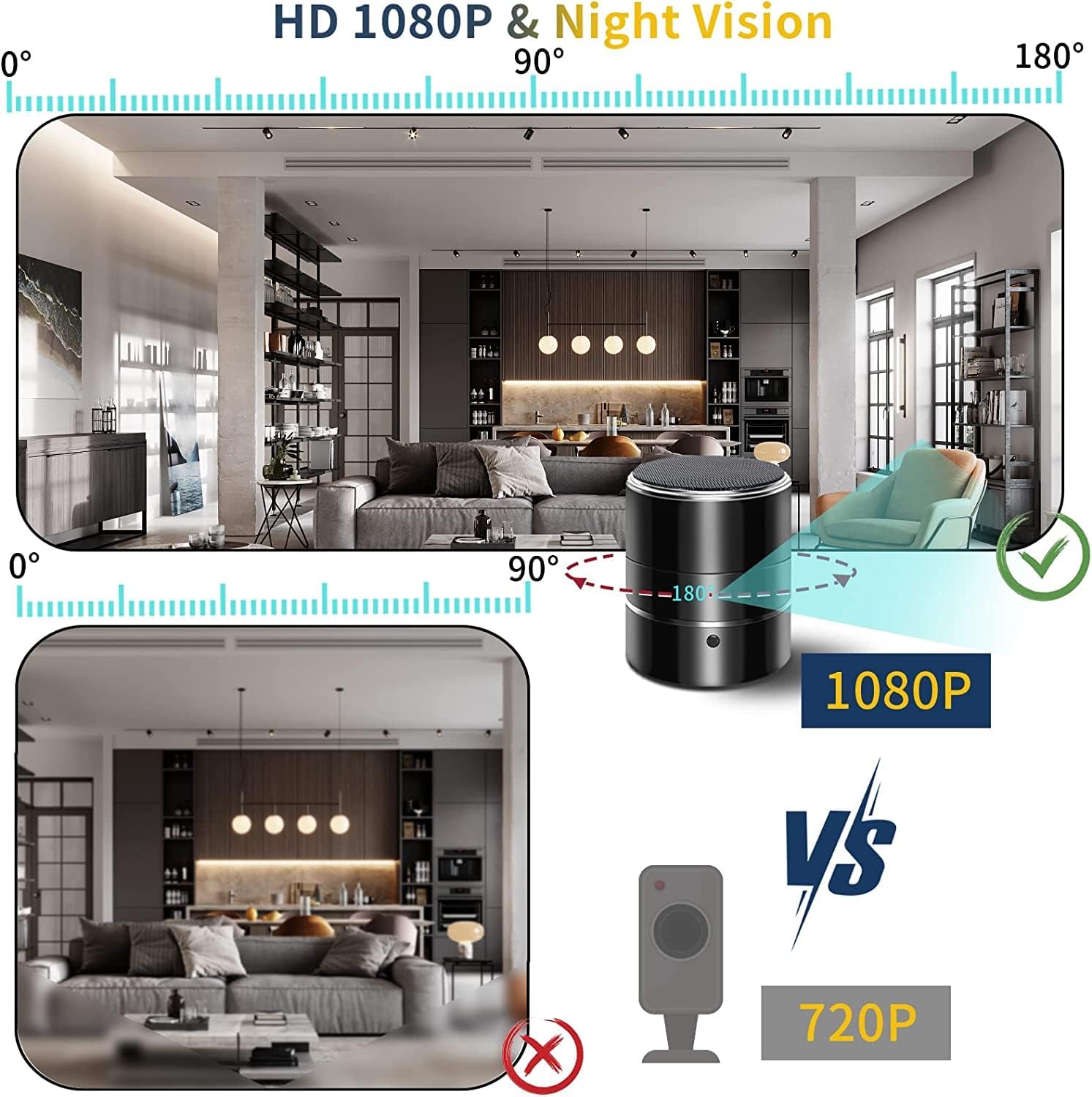 【180° WIDE-ANGLE LENS】 : The security camera lens is capable of rotating up to 180 degrees, so you can get the best view of any room in your home, perfect for both home and business security. To rotate the camera,just simply pan the live video to the left or right via streaming app.