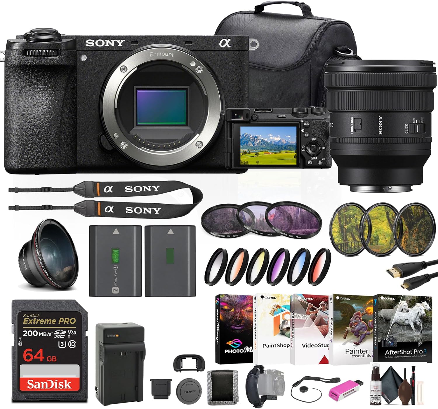 SONY USA Authorized. Included Items: Sony a6700 Mirrorless Camera, Sony FE PZ 16-35mm f/4 G Lens, 3 Piece Filter Kit, Wide Angle Lens, Graduated Color Filter Kit, Soft Bag, 64GB Extreme Pro SDXC Memory Card, NP-FZ100 Battery, NP-FZ100 Charger, Memory Card Reader, Photo Software, Micro HDMI Cable, Flexible Tripod, Hand Strap, Memory Card Wallet, Lens Cap Keeper, Cleaning Kit