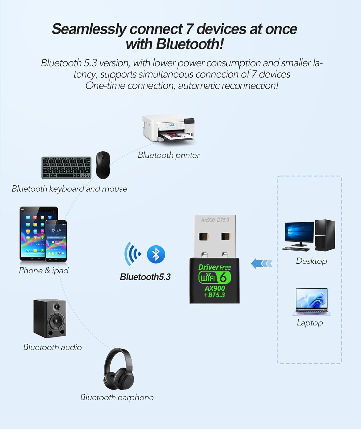 【Wi-Fi 6 AX900Mbps】Bluetooth WIFI adapter for PC features the latest Wi-Fi 6 technology, delivering speeds up to 600Mbps on 5GHz and 287Mbps on 2.4GHz. It supports MU-MIMO for connecting multiple devices, improving network efficiency. This fully demonstrates the advantages of Wi-Fi 6 in multi-user, multi-scenario, and multi-demand environments, Enjoy lag-free performance and smooth connectivity at full speed for your devices.