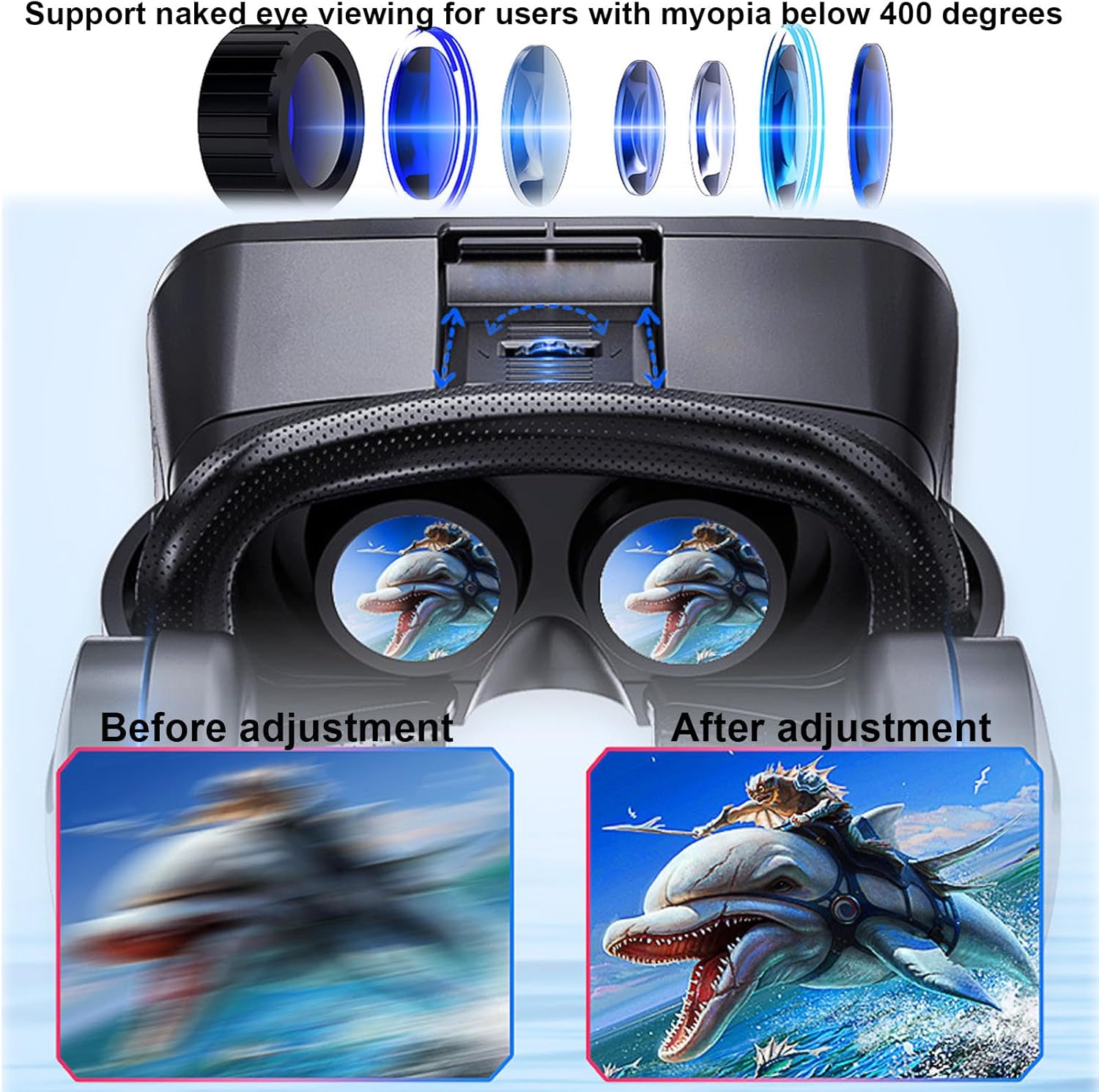 👀 【Eye Protection HD Lenses】Our VR glasses use advanced non spherical optical components with anti blue light functions, which not only protect your vision but also reduce eye fatigue during long-term use. The pupil-object distance is double-adjusted, which supports naked-eye viewing for users with myopia below 600°, and supports wearing myopia.