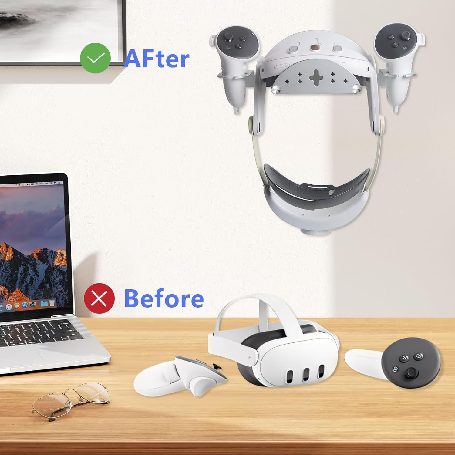 Space-Saving & Clutter-Free: This VR wall hanger keeps your headset and controllers off the desk, freeing up valuable surface space and reducing accidental damage risks. It creates a tidy gaming area, so you can enjoy immersive gameplay without searching for misplaced gear